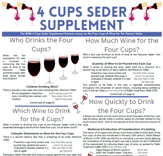 Compiling essays from the four recent issues of Oneg Shabbas on drinking the four cups of wine at the Passover Seder, the 2026 4 Cups Seder Supplement is available, with the following essays: Who Drinks the Four Cups? Which Wine to Drink for the 4 Cups? How Much Wine for the Four Cups? How Quickly to Drink […]