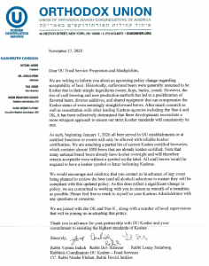 As of the first of January, “all beer served in OU establishments or at certified functions or events will only be allowed with reliable kosher certification,” reads the letter, signed by Rabbi Yermia Indich, Rabbi Dov Schreier, and Rabbi Lenny Steinberg, rabbinic coordinators with OU Kosher – Food Services. The letter notes that a partial list of current kosher-certified breweries was attached, which is available here.